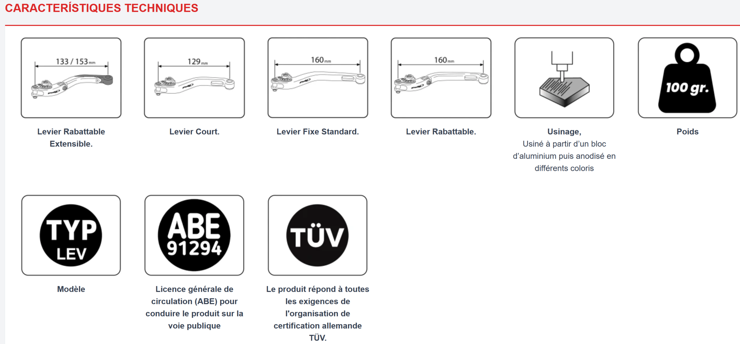Le kit comprend 1 levier de Frein +1 levier d’embrayage +2 adaptateurs pour votre moto / réglable en longueur et pliable en cas de chute.